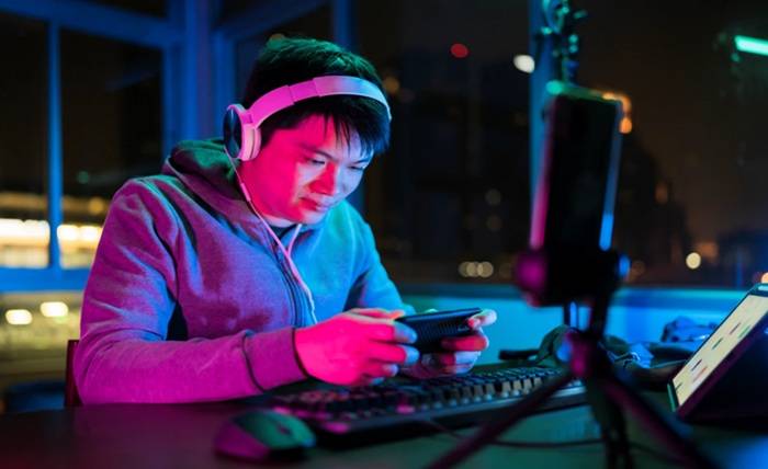 asian male esports gamer playing online sport leagues multiplayer game via smartphone with exited and cheerful emotion,asian male wear headset playing smartphone game online together with friends